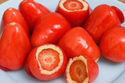Popular nas redes sociais como “morango do amor”, o bombom de morango…