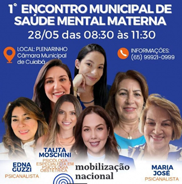 A Câmara Municipal de Cuiabá sedia, no próximo dia 28 de maio de 2025, o 1º Encontro Municipal de Saúde Mental Materna. O evento gratuito é uma iniciativa da vereadora Maysa Leão, em parceria com o Movimento Nacional da Saúde Materna de Cuiabá, e será realizado das 8h30 às 11h30, no auditório Plenarinho da Casa de Leis.