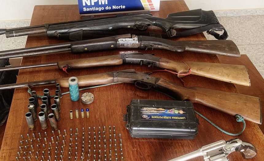 Em diligência, os policiais fizeram buscas pela região. O suspeito foi localizado na propriedade. No local, foram apreendidas três espingardas calibre .20 e .36 com numeração ilegível, um revólver calibre .38, uma carabina de pressão calibre 5.5 e 189 munições calibre .22 intactas.