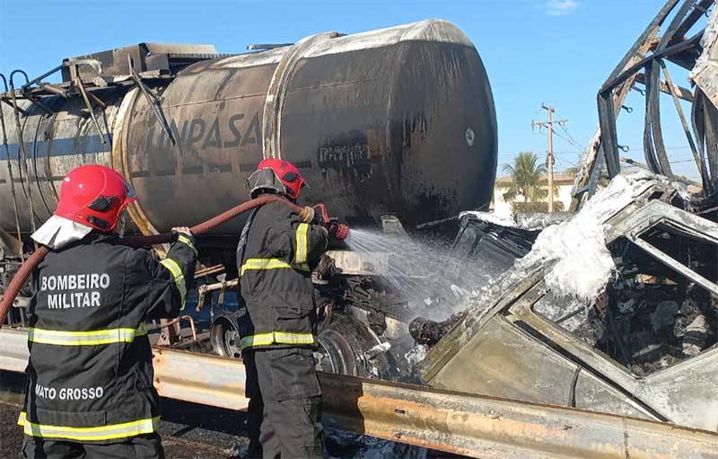 Bombeiros combatem incêndio após colisão entre duas carretas e um ônibus em Rondonópolis