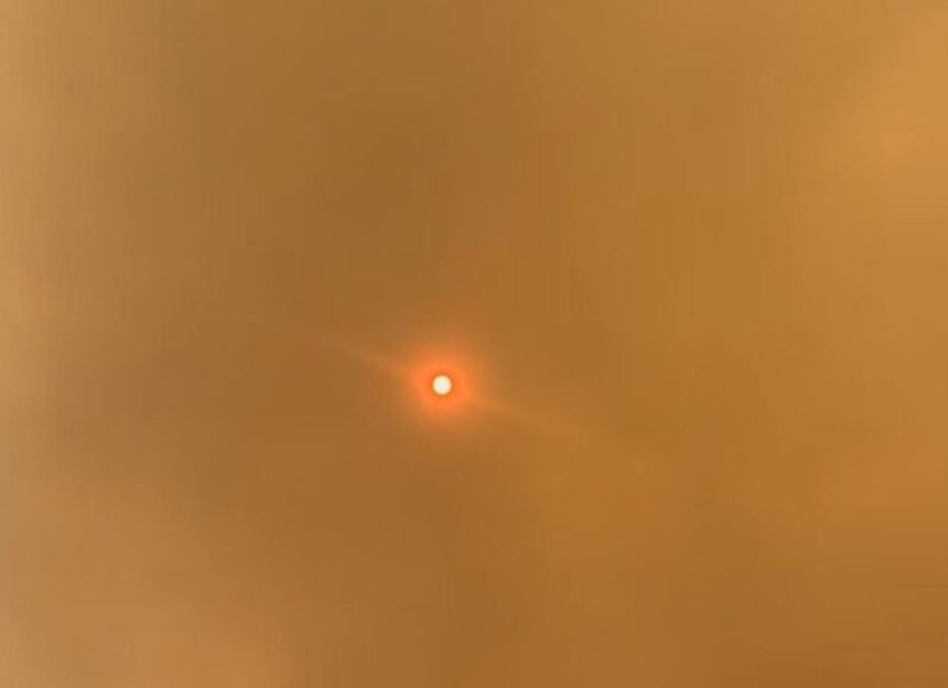 A fumaça dos incêndios florestais deixou o céu completamente amarelo em Cáceres (218 km de Cuiabá), nesta terça-feira (10), e assustou os moradores.