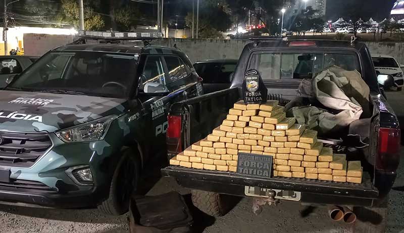 Ainda em continuidade da operação, por volta de 19h30, durante patrulhamento pela região do bairro Novo Horizonte, os militares abordaram um homem que estava em uma caminhonete. Em revista pessoal a ele, nada de ilícito foi encontrado. Já na carroceria do veículo, os policiais localizaram uma mala e bolsa contendo 96 tabletes de maconha.