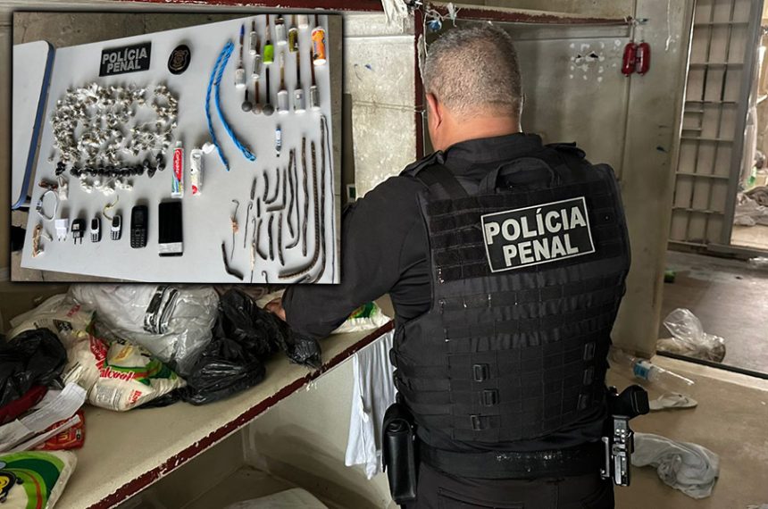 Foram apreendidos 49 carregadores, 35 armas artesanais (feitas com pedaços de ferro e madeira), 30 fones de ouvido e uma máquina de tatuar, entre outros produtos ilícitos, 400 gramas de porções de maconha e cocaína, além de 404 pequenas porções de drogas embaladas individualmente.