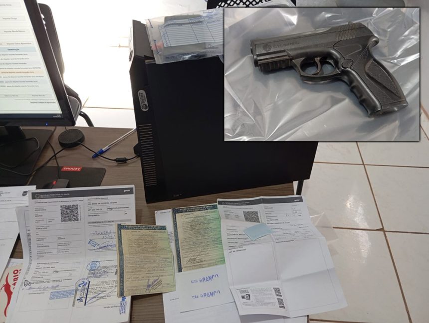 Já na casa dele, no bairro Vila Esperança, foram localizados documentos de veículos, um processo completo de transferência, um Documento Único de Transferência (DUT), quatro Certificados de Registro e Licenciamento de Veículo (CR-V), além de um simulacro de arma de fogo.