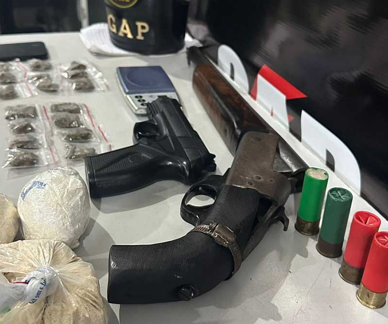 Os militares realizaram buscas dentro do imóvel e localizaram todo o material irregular, sendo uma espingarda de calibre 12 com três munições, um simulacro de arma de fogo do tipo pistola, 12 porções de maconha skank, oito porções de maconha, 19 porções de cocaína e pedras de pasta base.
