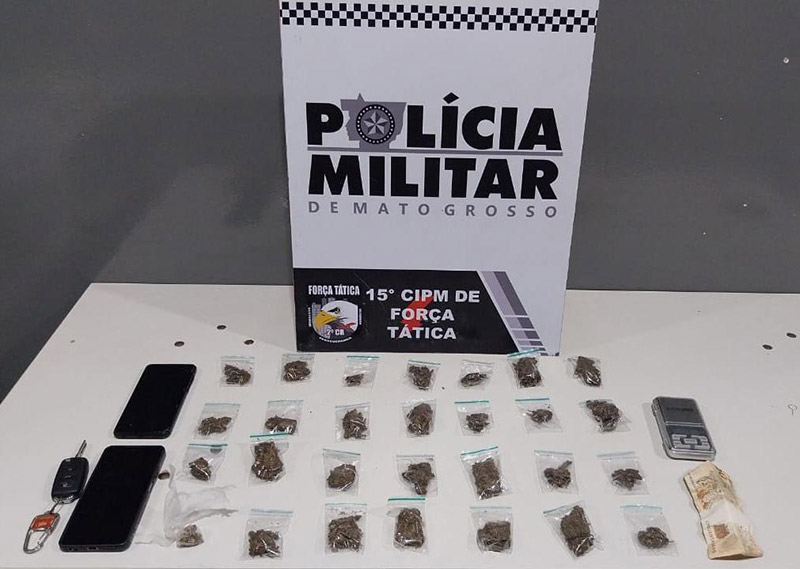 A guarnição se deslocou até os endereços indicados pelo homem, que tentou enganar a equipe informando locais falsos. Mas, foi em sua residência, no bairro São Simão, que os militares encontraram outras 17 porções de maconha, além de uma balança de precisão e materiais usados para embalar os entorpecentes.