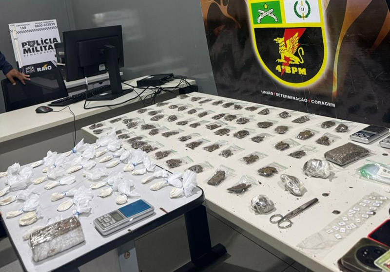 Os dois homens se entregaram ao verem a chegada dos policiais e revelaram o local onde as drogas estavam escondidas. Nas buscas no imóvel, foram encontradas 30 porções de cocaína e maconha, além de balanças de precisão, celulares e 21 chips de telefone.
