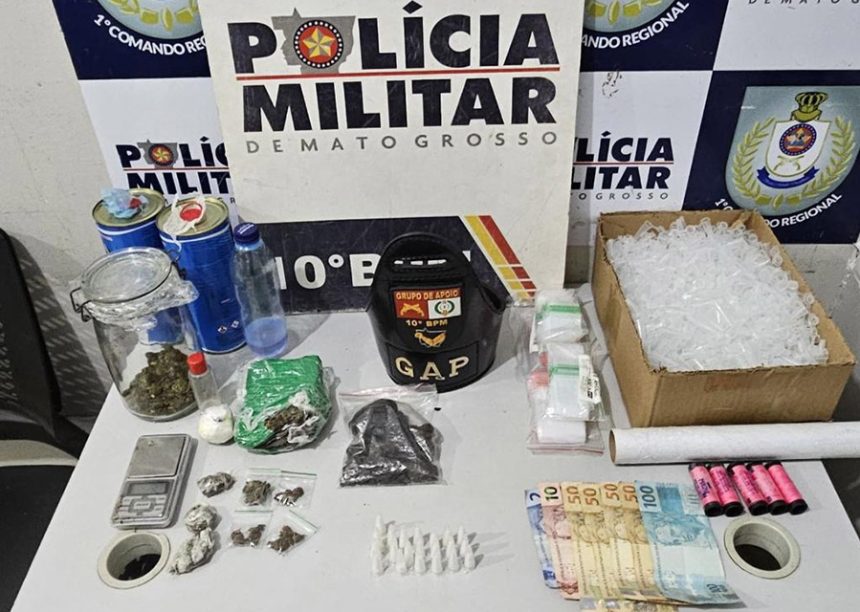 Policiais militares do 10º Batalhão prenderam em flagrante um homem, de 19 anos, por tráfico ilícito de drogas, na noite desta quarta-feira (04.6), em Cuiabá. Com o suspeito, a PM apreendeu porções de substâncias análogas a maconha e cocaína e frascos contendo entorpecente conhecido como “loló”.