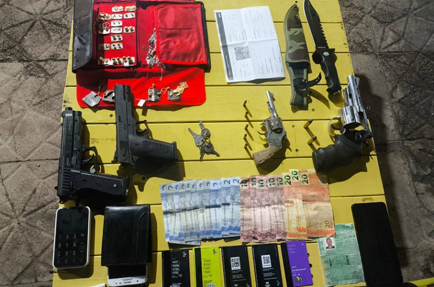 Na ação, as equipes apreenderam um veículo Fiat Pálio, dois revólveres, dois simulacros de arma de fogo, uma faca, um kit de joias, uma maquininha de cartão e R$ 170 em espécie.