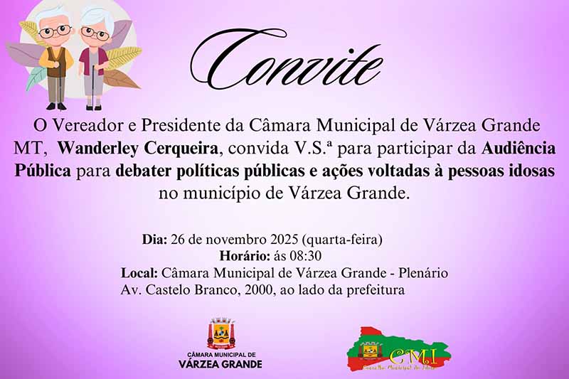 A Câmara Municipal de Várzea Grande reforça o convite à população para acompanhar e participar da audiência pública que discutirá políticas públicas e ações voltadas às pessoas idosas no município. O encontro será realizado nesta quarta-feira, 26 de novembro, às 8h30, no Plenário da Câmara, localizado na Avenida Castelo Branco, nº 2000.