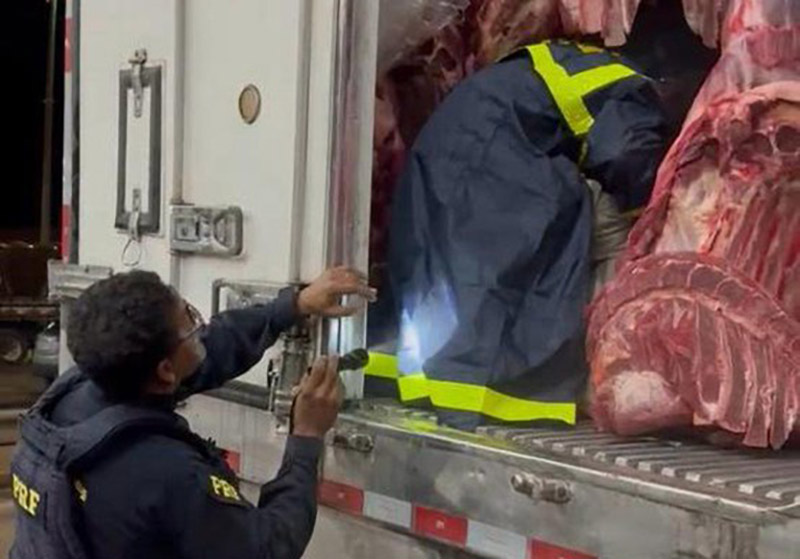Durante a fiscalização, os policiais notaram sinais de manipulação nos parafusos das travas das portas do baú frigorífico, o que motivou uma inspeção detalhada. Dentro do compartimento, foram encontrados sacos de diferentes cores contendo cloridrato de cocaína, pasta base e skunk, totalizando aproximadamente 424 kg. Um teste preliminar confirmou a presença das drogas.