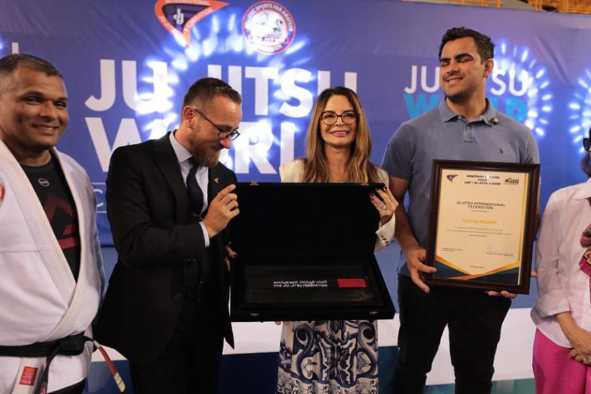 O reconhecimento à primeira-dama do Estado foi entregue pelos membros da diretoria da JJIF, Christian Horvath e Joachim Thumfar, representando o Governo dos Emirados Árabes Unidos, que prioriza o Jiu-Jitsu como uma ferramenta para o desenvolvimento intelectual, disciplina e relações comerciais entre países que apoiam o esporte.