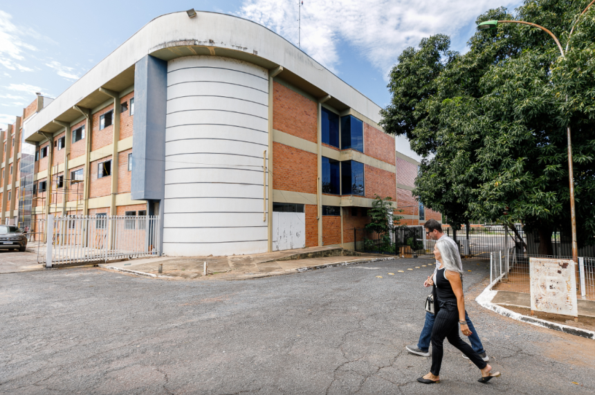 A imagem mostra a secretária de Saúde de Cuiabá, Kécia Helena, acompanhada do promotor Milson Mattos, durante uma visita ao local onde será instalado o novo Centro de Saúde. A imagem exibe a fachada principal do prédio.