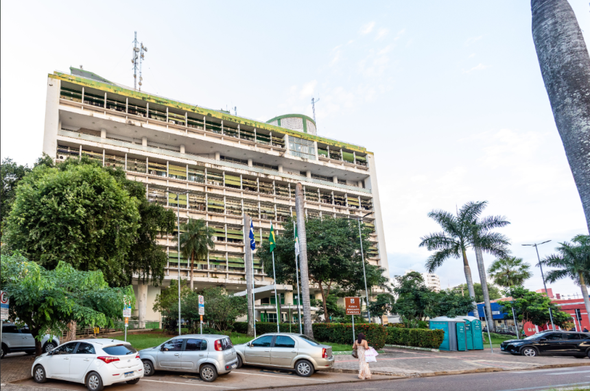 A foto mostra o prédio do Palácio Alencastro, sede da Prefeitura de Cuiabá. Em destaque, a via pública em frente ao prédio, com três carros estacionados em vagas na calçada.